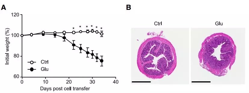 研究者首先嘗試高葡萄糖攝入是否會影響小鼠的自身免疫。他們選了一種常用的結(jié)腸炎模式小鼠,這種小鼠不能產(chǎn)生正常的成熟免疫細(xì)胞,通過給它移植T細(xì)胞可以激活腸道炎癥。當(dāng)研究者在T細(xì)胞移植前兩天給小鼠喂20%的糖水,它們移植后的病情明顯更加嚴(yán)重,體重減輕得更多,腸道組織的情況也更不妙。就算只喂10%的糖水,病情也會加重。
