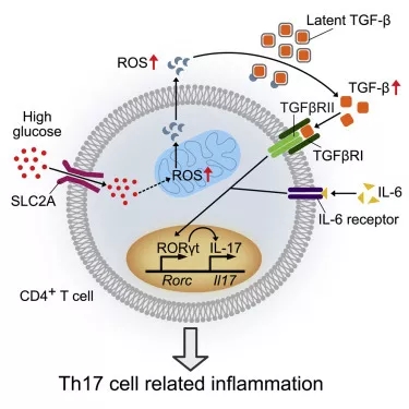 研究者們發(fā)現(xiàn),“超標(biāo)”的葡萄糖就像給細(xì)胞上滿了汽油,誘使線粒體以大功率運(yùn)轉(zhuǎn),產(chǎn)生的活性氧(ROS)激活了轉(zhuǎn)錄生長因子β(TGF-β),從而促進(jìn)輔助T細(xì)胞17(Th17)生成,導(dǎo)致免疫系統(tǒng)進(jìn)一步失衡,加劇自身免疫性疾病。