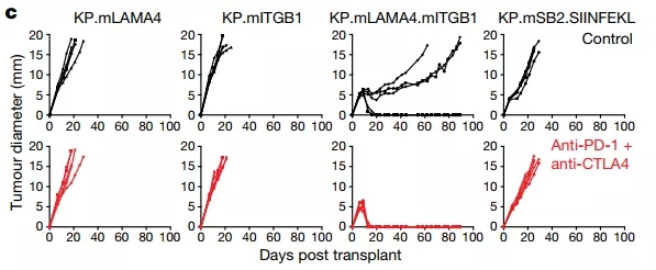 把新抗原表達(dá)不同的肉瘤細(xì)胞,注射到小鼠體內(nèi)時(shí),單獨(dú)表達(dá)mITGB1或者mLAMA4的癌細(xì)胞,并不能誘導(dǎo)抗癌免疫應(yīng)答,腫瘤該怎么長怎么長;但兩種新抗原同時(shí)表達(dá)時(shí),腫瘤的生長速度卻變慢了,明顯是受到了免疫應(yīng)答的殺傷!