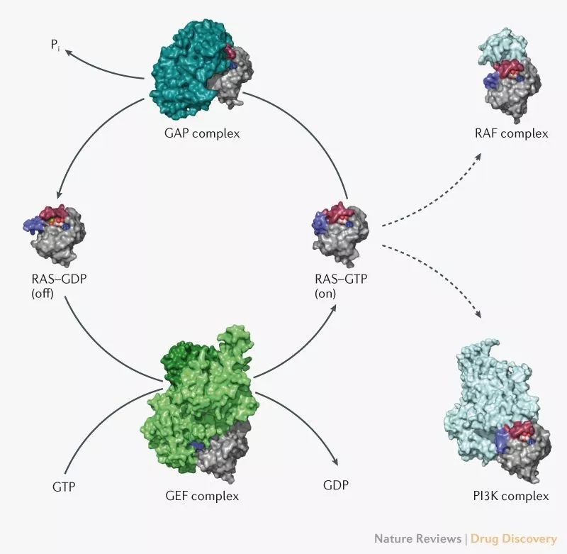 KRAS與GTP結合時處于“開啟”狀態,與GDP結合時處于“關閉”狀態,其構象在不同狀態時有所不同,這種不同調節了其結合“伙伴”的能力,如SOS1、PI3K、RAF以及GAPs.(圖片來源:Nature Reviews Drug Discovery)
