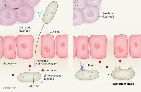 為了檢測是否能夠開發出一種方法來特異性地從小鼠機體中移除產生細胞溶素的糞腸球菌,研究者識別出了一種能靶向作用糞腸球菌但并不會影響其它腸道菌群的噬菌體,他們發現,相比移植了能夠殺滅在動物機體中并不經常存在的細菌的小鼠而言,接受了人類糞便移植、高酒精含量飲食且給予了靶向作用糞腸球菌噬菌體的小鼠的肝臟損傷程度較低。