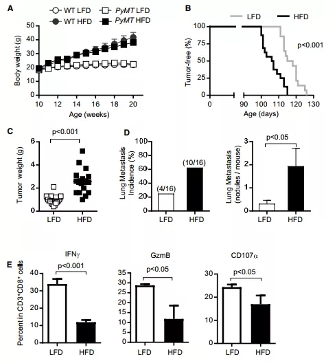 為了驗證這個猜想,研究團隊選擇了自發性的乳腺癌小鼠模型,用高脂飲食誘導的方式,營造出理想的“肥胖促癌”狀態。果不其然,高脂飲食組的小鼠乳腺癌發生得明顯更快,腫瘤內浸潤的效應T細胞比例也顯著偏低。