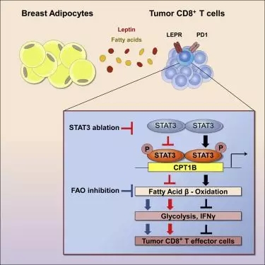 希望之城癌癥研究中心Hua Yu教授的團隊發現,在肥胖推動的乳腺癌當中,效應T細胞會被瘦素或者PD-1影響,在轉錄因子STAT3的驅動下發生代謝重編程,以脂肪酸氧化取代糖酵解,作為主要的能量來源。