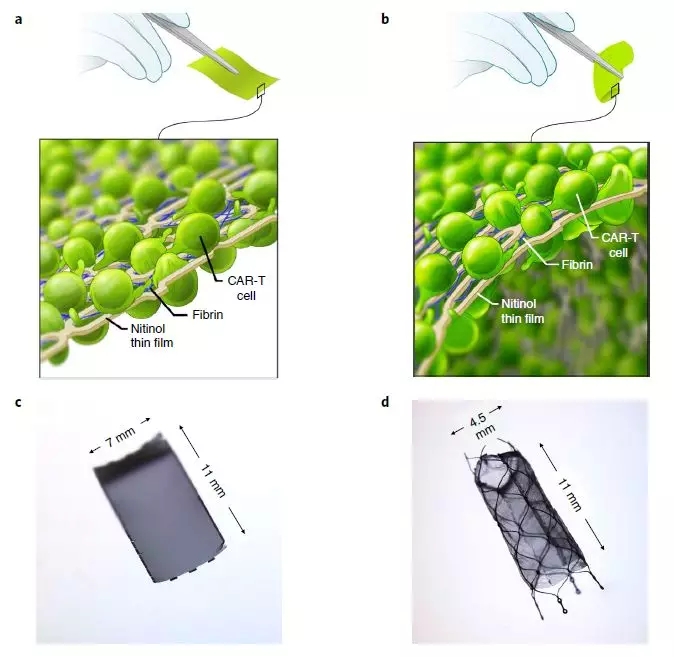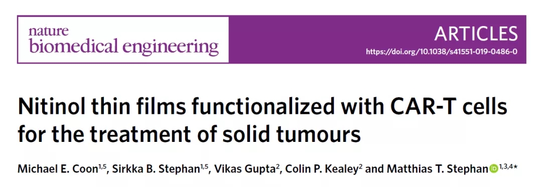 Nitinol thin films functionalized withCAR-T cells for the treatment of solid tumours, Nature Biomedical Engineering(2019). DOI: 10.1038/s41551-019-0486-0.