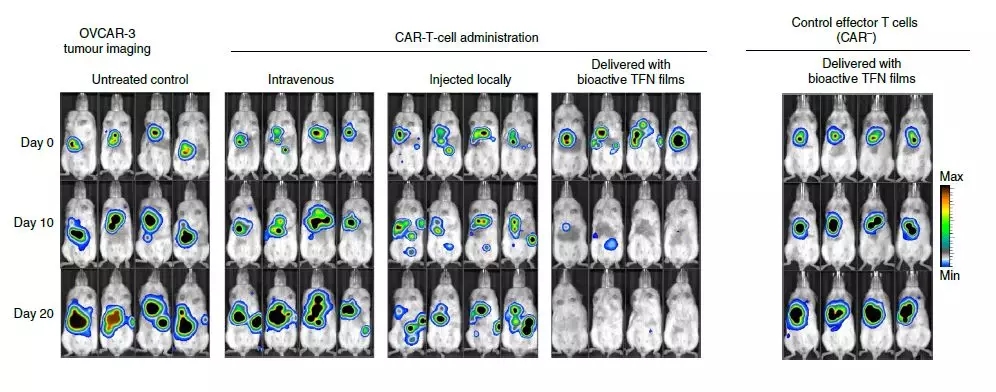 在小鼠卵巢癌腫瘤模型中,研究人員 將靶向腫瘤抗原ROR1的CAR-T細胞包埋于上述鎳鈦薄膜中,并植入被卵巢癌細胞侵襲的小鼠隔膜處。在第20天,70%的小鼠腫瘤已經完全消失。