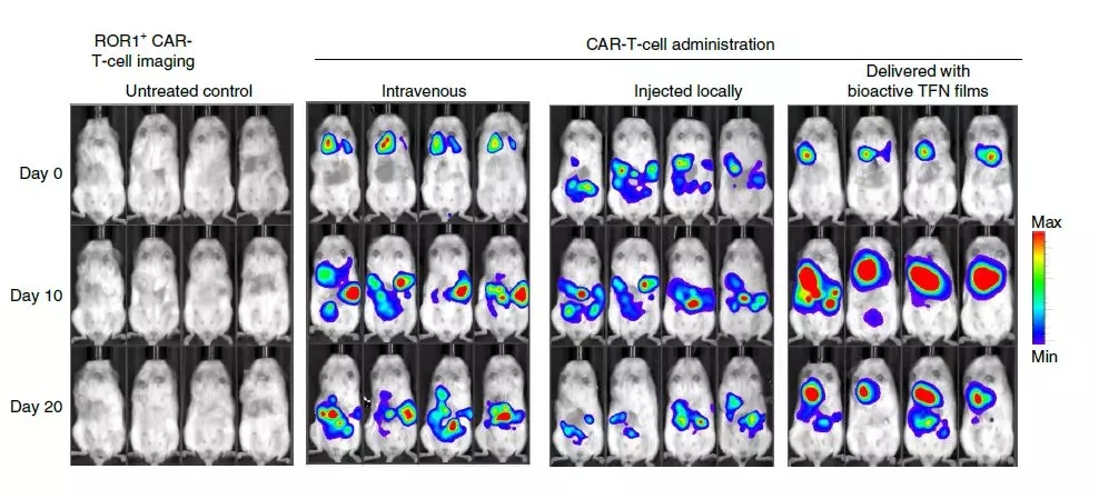 對于實體瘤,靜脈注射CAR-T細胞后,CAR-T細胞很難進入腫瘤組織中,即使是進入腫瘤組織的CAR-T細胞,也因為腫瘤微環境中免疫抑制因子、營養失衡等因素難以增殖并發揮殺傷功能。在該研究中,研究人員將CAR-T細胞包埋于鎳鈦薄膜中,在小鼠模型中,可消除70%腫瘤,并可使CAR-T細胞擴增232倍。該研究成果為細胞療法有效對抗實體瘤邁出了重要一步。