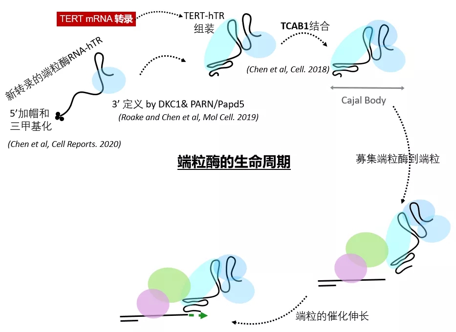 端粒酶(telomerase)是人體,乃至單細(xì)胞酵母中,可以直接延長端粒的唯一分子機(jī)器。這個(gè)蛋白RNA復(fù)合體以非編碼RNA亞基hTR為模板,由逆轉(zhuǎn)錄酶TERT去催化端粒的延長。端粒酶的活性對TERT和hTR的分子豐度非常的敏感:單拷貝TERT或hTR的失活突變會造成50%的端粒酶的下降,但也足以引發(fā)先天性的短端粒早衰病;表達(dá)外源的TERT和/或hTR在體外細(xì)胞系里足以引發(fā)端粒的延長,也證明了提高hTR的分子水平對延長端粒的可行性。hTR的調(diào)控主要發(fā)生于轉(zhuǎn)錄后的一系列的RNA biogenesis步驟,包括hTR轉(zhuǎn)錄后的修飾(PTM)和成熟,細(xì)胞內(nèi)的定位,以及和TERT的有效組裝,直至形成能夠延長端粒的全酶(見下圖)。