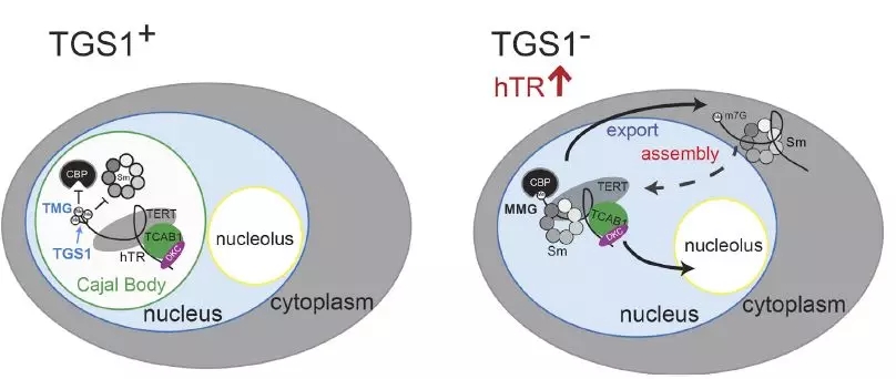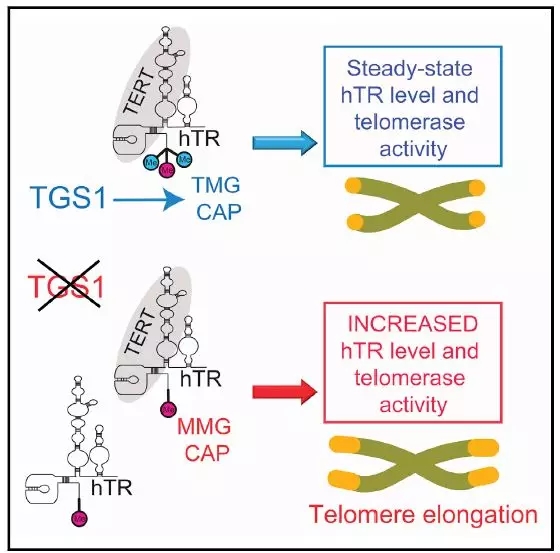 該研究第一次提供證據(jù)表明在人細(xì)胞里RNA三甲基化鳥苷合成酶(TGS1) 直接修飾了端粒酶RNA (hTR) 的三甲基化帽,TGS1的缺失會導(dǎo)致hTR的分子豐度和端粒酶活性的等比例增加,以至于人細(xì)胞內(nèi)的端粒的伸長。