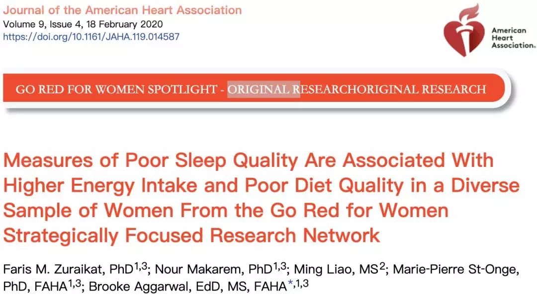 2020年2月17日,美國心臟協會雜志(Journal of the American HeartAssociation)在線發表了哥倫比亞大學歐文醫學中心的題為:Measures of Poor SleepQuality Are Associated With Higher Energy Intake and Poor Diet Quality in aDiverse Sample of Women From the Go Red for Women Strategically Focused ResearchNetwork 的研究論文。