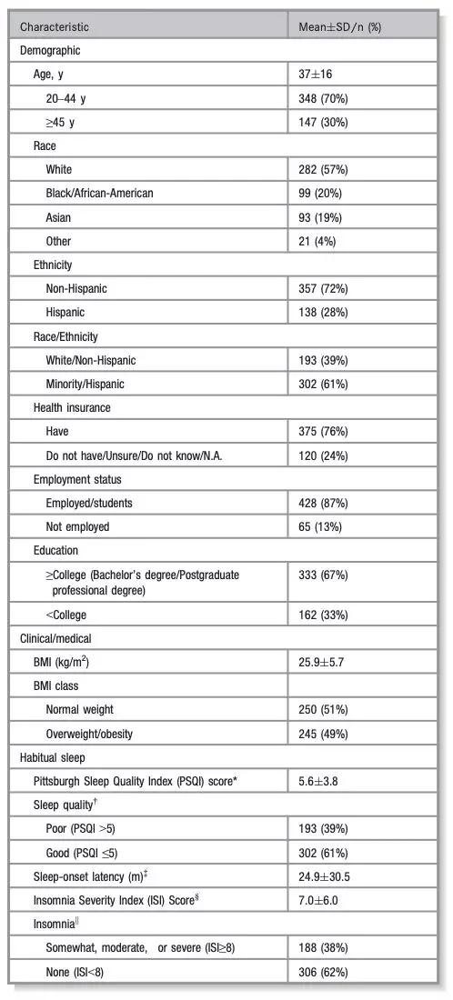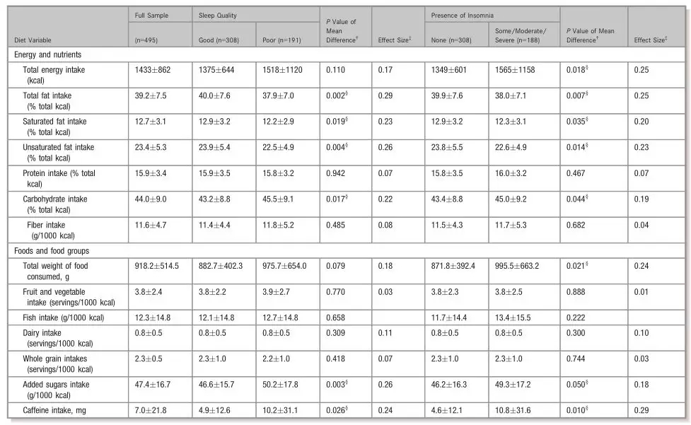 如下圖所示,研究人員記錄了495名女性的睡眠和飲食習慣,她們的種族不同,年齡在20至76歲之間。本研究的重點在于這些女性的睡眠質量、入睡時間和失眠情況,因此,這些女性需要報告了其一年四季通常所吃食物的類型和數量,據此,研究人員能夠更好的衡量她們的飲食習慣。