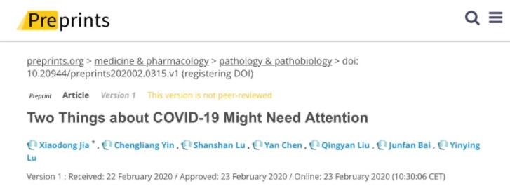 Jia, X., et al. Two Things about COVID-19Might Need Attention. Preprints. 23 Feb, 2020.