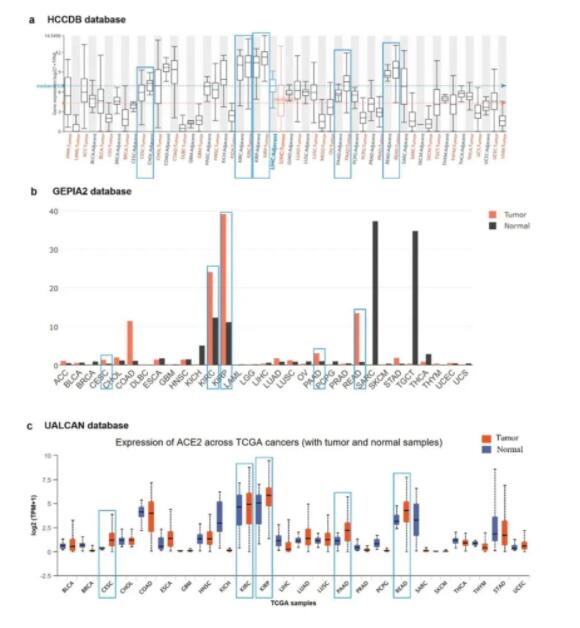 研究者發現五種癌癥,包括宮頸鱗狀細胞癌和宮頸內膜腺癌、胰腺腺癌、腺癌、腎乳頭狀細胞癌、腎透明細胞癌等腫瘤組織中 ACE2表達較周圍組織更高,前三種尤甚。其中胰腺癌組織ACE2表達量顯著高于肺部,宮頸癌組織ACE2表達量與肺部相近,因此這幾種癌癥患者被SARS-CoV-2感染的可能性增加。