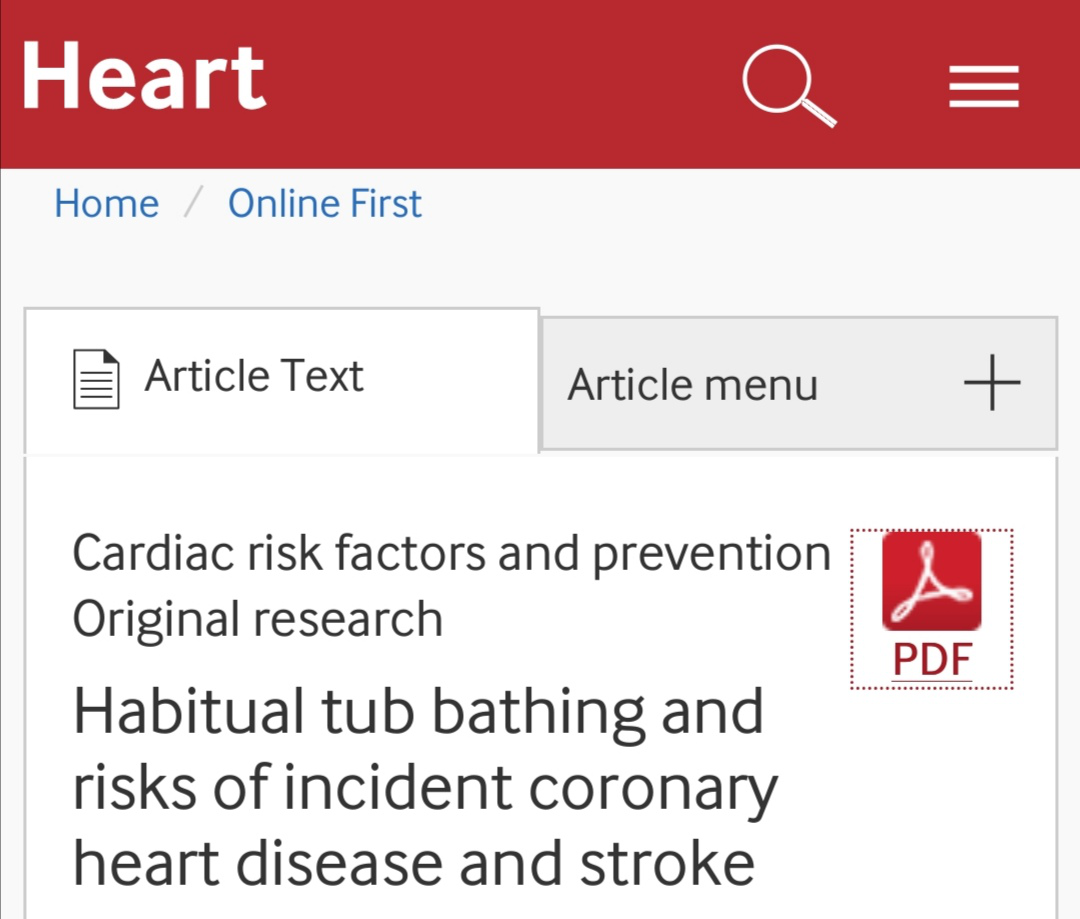 1.Habitual tub bathing and risks ofincident coronary heart disease and stroke, Heart (2020). DOI:10.1136/heartjnl-2019-315752