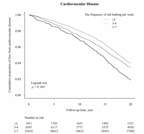 在排除了潛在影響因素后,對數據的分析表明,與每周一至兩次泡澡或根本不泡澡相比,每天洗熱水澡可以降低28%的心血管疾病總風險,降低26%的中風總風險,而浴缸浴的頻率與心源性猝死的風險增加無關。