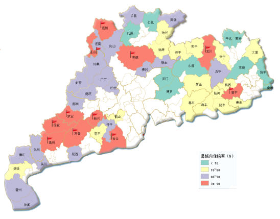 其中:高州市、連州市、陽春市、羅定市、英德市、信宜市、連山縣、臺山市、新興縣、龍川縣、普寧市11個縣(市)超過90%;縣域內住院率85%-90%的縣(市)5個;80%-85%的縣(市)15個;小于70%的10個縣(市)。