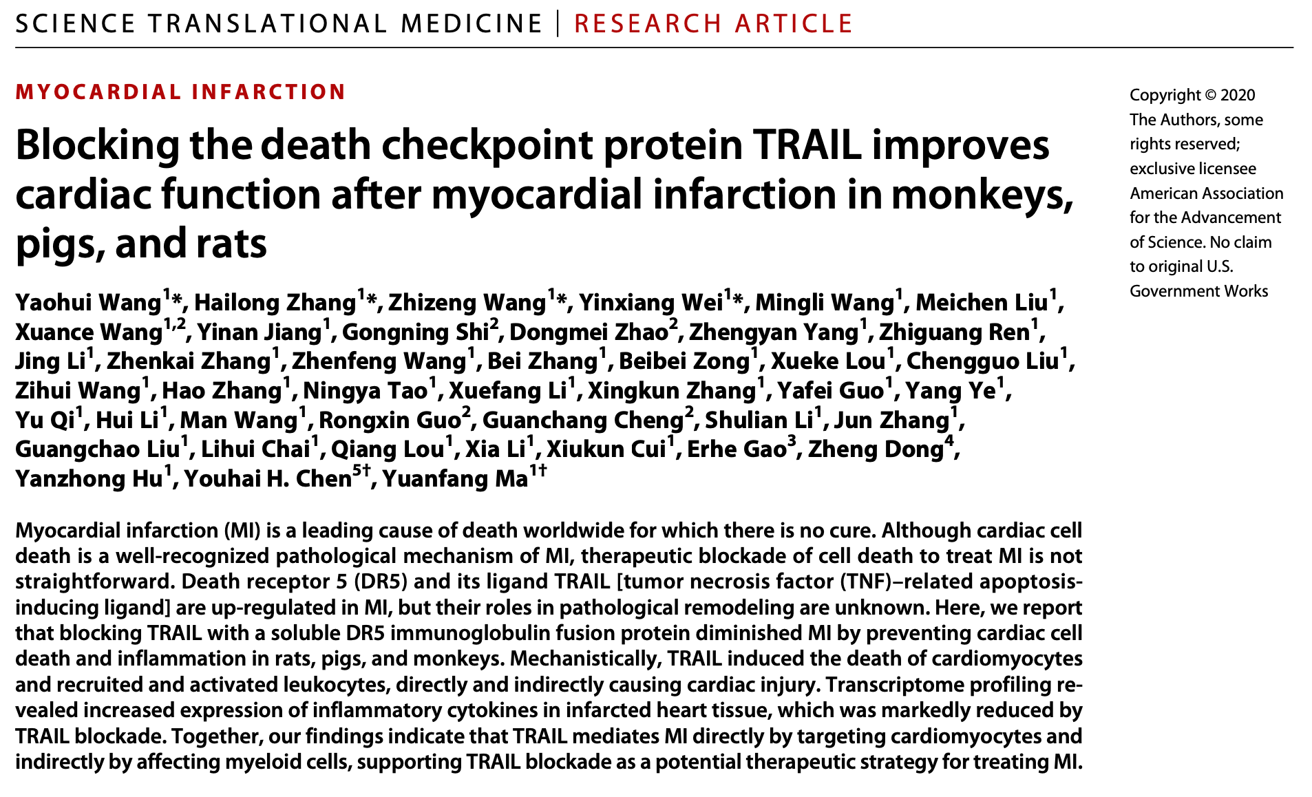 [1].Wang Y, Zhang H, Wang Z, et al. Blocking the death checkpoint protein TRAIL improves cardiac function after myocardial infarction in monkeys, pigs, and rats[J]. Science Translational Medicine, 2020, 12(540).