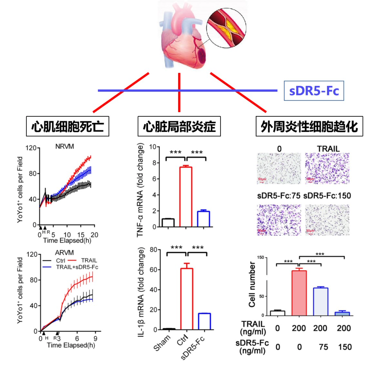 此外,他們還首次在多種動物模型中證實,用可溶性DR5-Fc融合蛋白(sDR5-Fc),可阻斷體內TRAIL與DR5結合,減少心肌梗死后的心肌細胞死亡與炎癥反應并改善心臟功能。