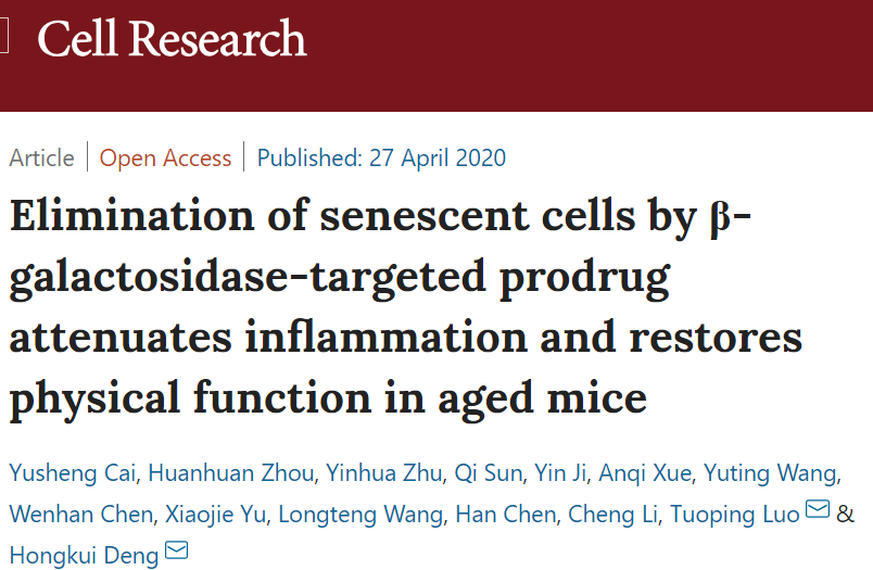 該項工作中,鄧宏魁課題組與羅佗平課題組合作,在 Cell Research 發表了題為Elimination of senescent cells by β-galactosidase-targeted prodrug attenuates in?ammation and restores physical function in aged mice 的研究論文。