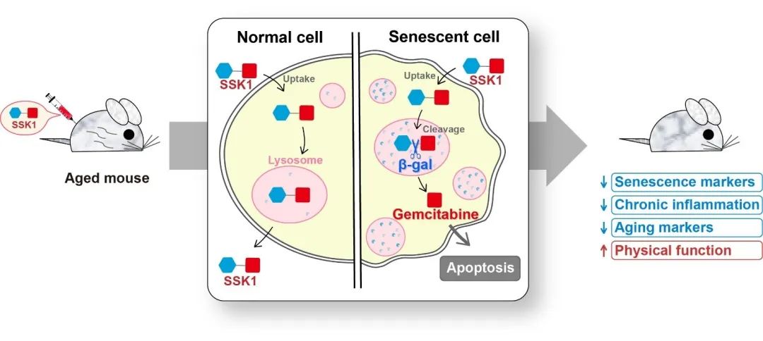 圖:在老年小鼠中,SSK1可以選擇性被衰老細胞的β-gal切割激活,特異性清除體內衰老細胞,降低衰老相關的特征,緩解慢性炎癥,并恢復老年小鼠生理功能