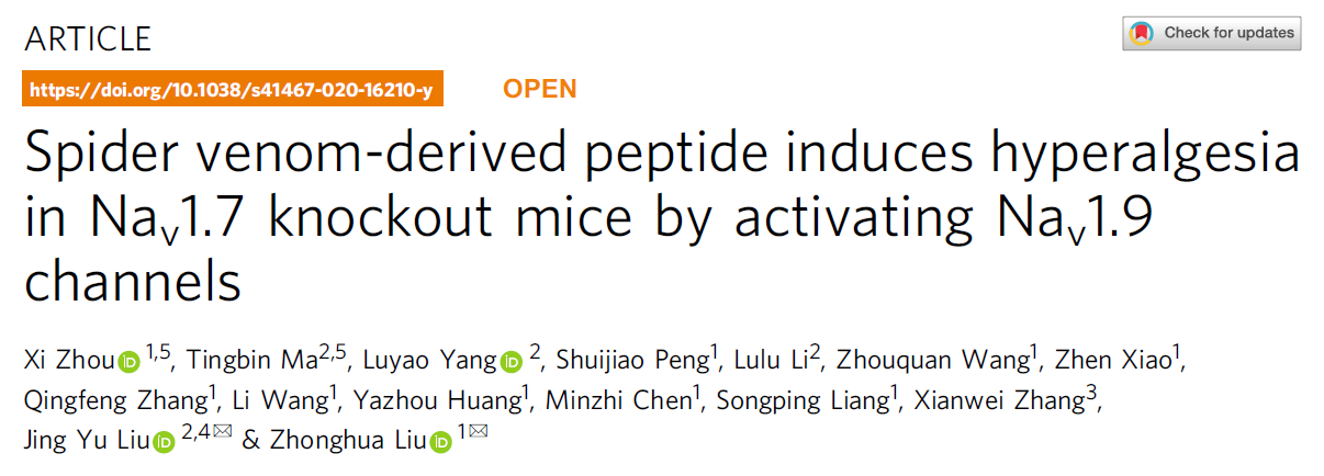 近日,湖南師范大學(xué)劉中華教授和華中科技大學(xué)/中國科學(xué)院神經(jīng)科學(xué)研究所劉靜宇教授團隊合作,在 Nature Communications 在線發(fā)表了題為:Spider venom-derived peptide induces hyperalgesia in Nav1.7 knockout mice by activating Nav1.9 channels 的最新研究成果。