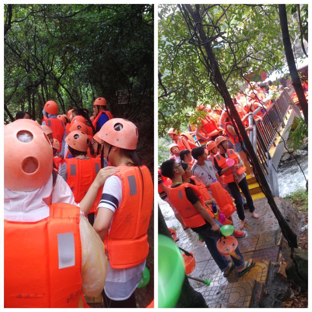 經(jīng)過(guò)1個(gè)半小時(shí)的車(chē)程,我們終于到達(dá)清遠(yuǎn)最具吸引力、最刺激、最好玩的漂流勝地黃騰峽。我們即將挑戰(zhàn)的是黃騰峽的勇士漂。“勇士漂”全長(zhǎng)2.5公里,總落差168米,最高落差高達(dá)12米。沿著山路往上走,峽谷越來(lái)越陡峭,小伙伴們穿好救生衣,戴好安全帽,隨時(shí)準(zhǔn)備漂流。聽(tīng)著湍急水流聲,大家內(nèi)心也越發(fā)興奮,期待著緊張又刺激的漂流體驗(yàn)。